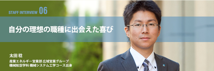 私は大学院で化石燃料について研究していたため、エネルギー業界に興味がわき、地場のエネルギー産業の一翼を担う東邦ガスを志望先として選びました。また、東邦ガスには技術営業という分野があり、これは私が理想とする企画や提案型の仕事であったため、ひときわ興味が湧きました。もちろんほかにも、エネルギー関連の企業はあったのですが、調べてみると設備メンテナンス系統の職種での採用が目立ち、自分のキャリアビジョンとはうまく合致しなかったのです。