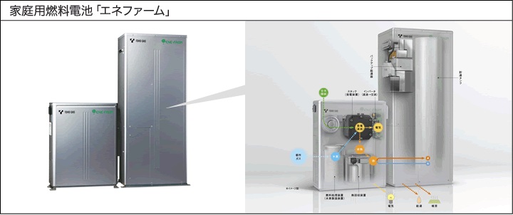 ご家庭で電気をつくり、熱も有効活用する、家庭用燃料電池「エネファーム」。都市ガスから取り出した水素と、空気中の酸素を化学反応させて電気を生み出します。発電時の排熱を利用してお湯を作るので、いつも通り電気を使っているだけで効率良くお湯を利用できます。 また、「エネファーム」とは別に、固体酸化物形燃料電池(SOFC)の実証実験を実施しています。より高い発電効率やコンパクト化が期待できるため、商品化に向けて取り組みを進めています。