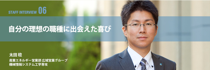 私は大学院で化石燃料について研究していたため、エネルギー業界に興味がわき、地場のエネルギー産業の一翼を担う東邦ガスを志望先として選びました。また、東邦ガスには技術営業という分野があり、これは私が理想とする企画や提案型の仕事であったため、ひときわ興味が湧きました。もちろんほかにも、エネルギー関連の企業はあったのですが、調べてみると設備メンテナンス系統の職種での採用が目立ち、自分のキャリアビジョンとはうまく合致しなかったのです。