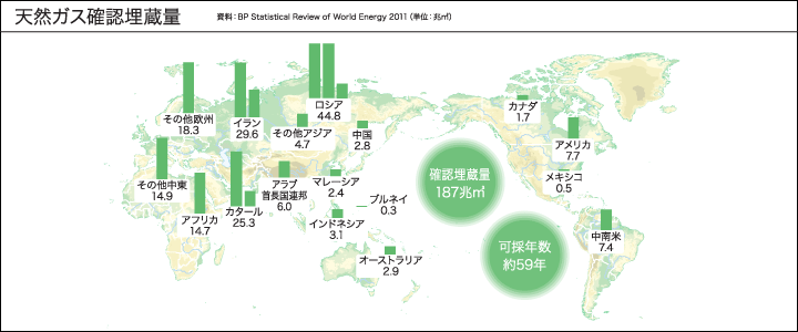 天然ガスのガス田は世界各地に豊富に存在し、可採年数は約60年と言われています。現在も新しいガス田が次々と発見され、埋蔵量の増加も予想されるなど、将来性も豊かな資源です。埋蔵量が中東に集中している石油とは異なり、ロシアやアジア、アメリカなど世界各地の様々な場所に埋蔵されているため、安定した供給が可能とされています。