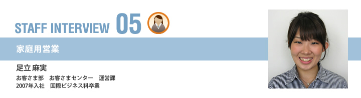 ありきたりかもしれませんが、お客さまから「ありがとう」などのお礼の言葉をいただいたときには、やりがいを感じます。「足立さんのおかげで・・・」と言われるととても嬉しい気持ちになります。反対に、まだ知識不足なことが多く、1人でお客さまのお申し出に対応してきれないときには苦労を感じます。