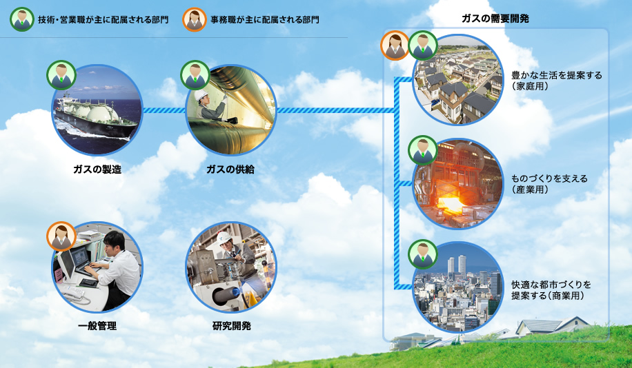 ガスの製造 ガスの供給 一般管理 研究開発 豊かな生活を提案する(家庭用) ものづくりを支える(産業用) 快適な都市づくりを提案する(商業用)